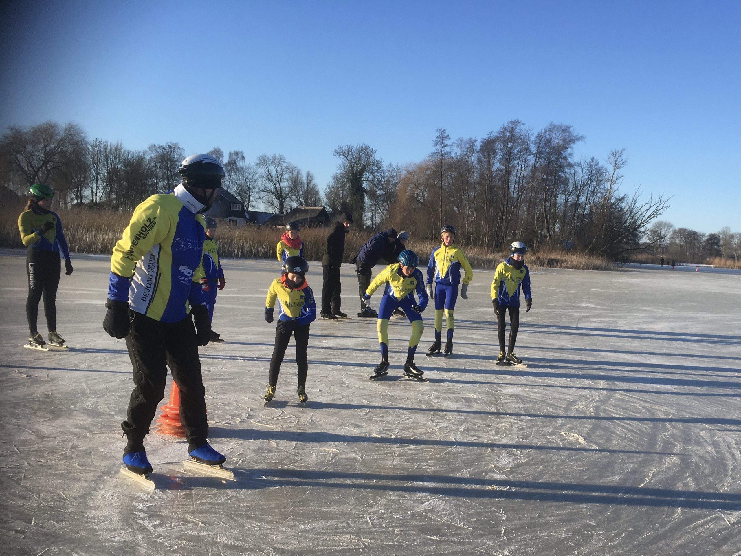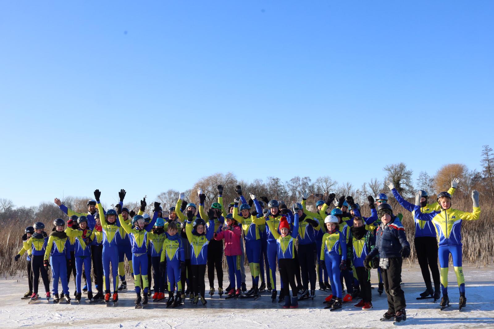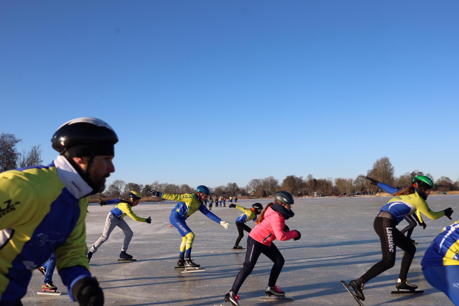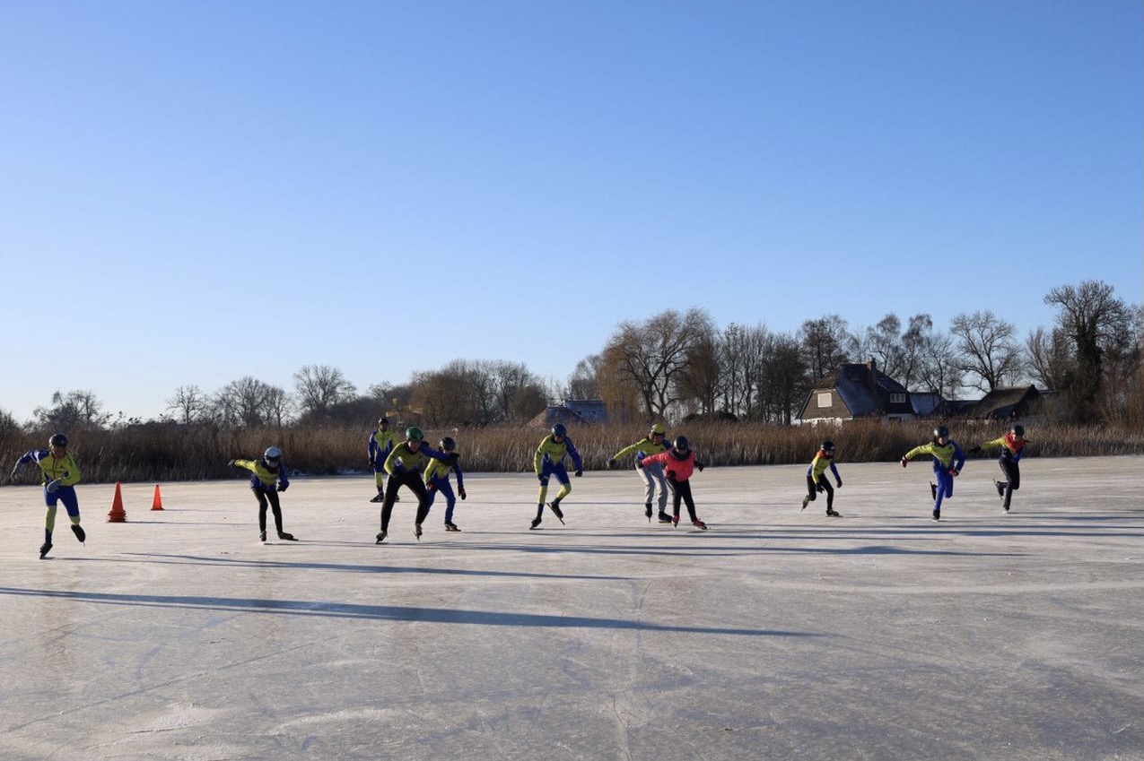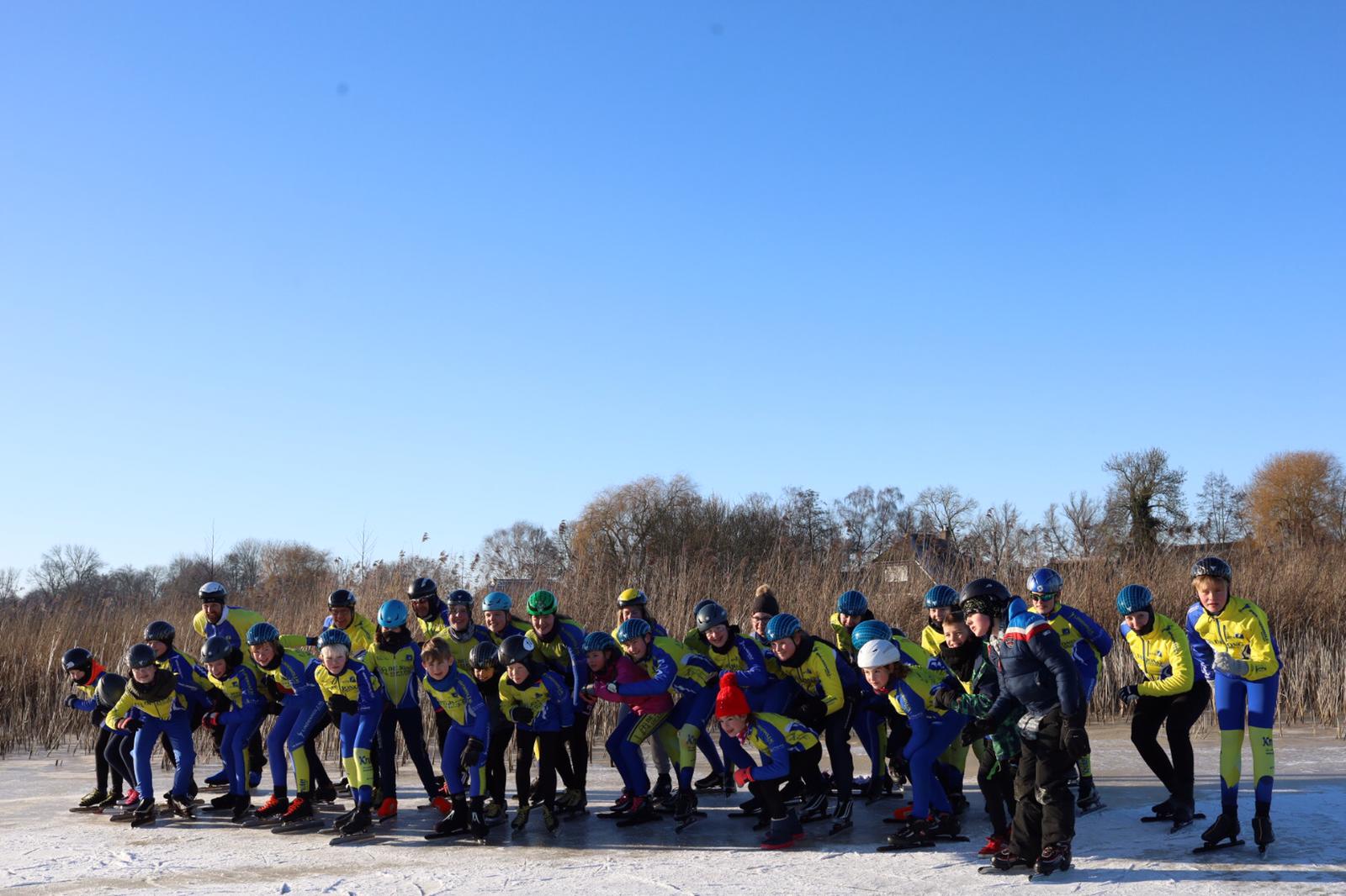 Op het Molengat was voldoende goed ijs te vinden om er een gevarieerde training van te maken.. Onder supervisie van Wim van der Heide en de pas aangetreden coördinator Natuurijs werden er groepen gevormd. Joan Lubbinge, Gerard Oord, Anna Sybrandy en Jeanne van Duinkerken verzorgden de training. Na de kennismaking met het ijs werd er begonnen. De opdrachten en aanwijzingen werden goed opgevolgd. Wat deden ze hun best om te letten op hun schaatshouding. De vaart zat er goed in. Er werden zelfs starts gemaakt, wel met drie op een rij. Ruimte zat! De training werd afgesloten met een estafette en een groepsfoto. Het zal iedereen nog lang heugen.