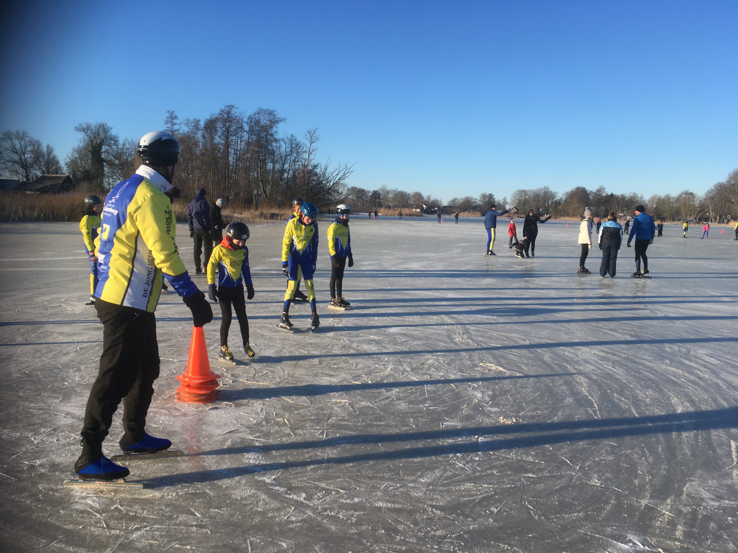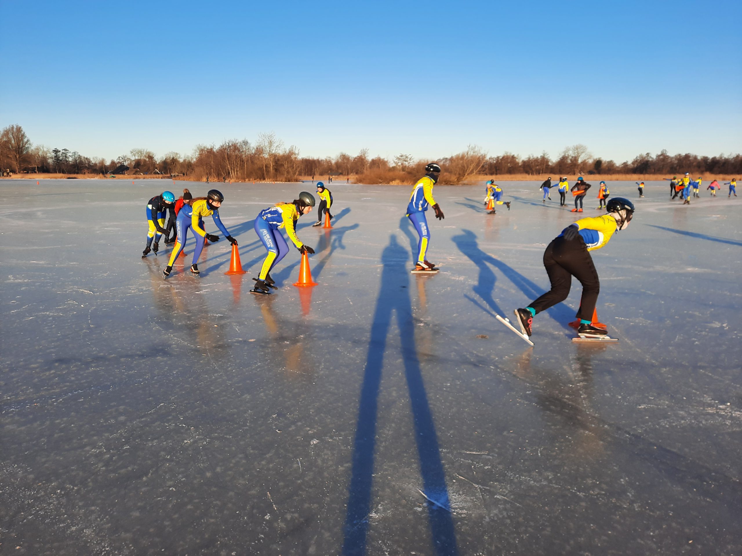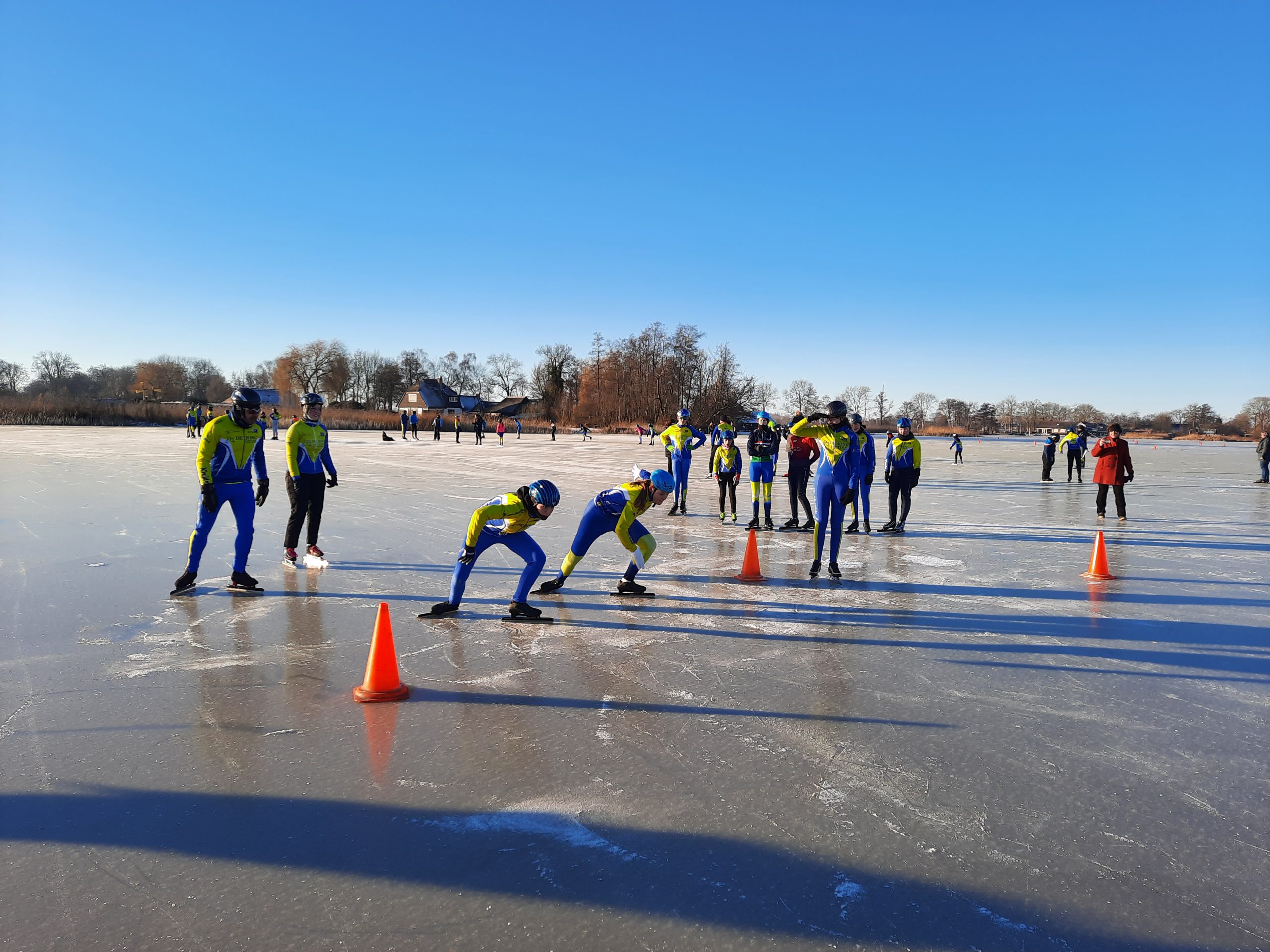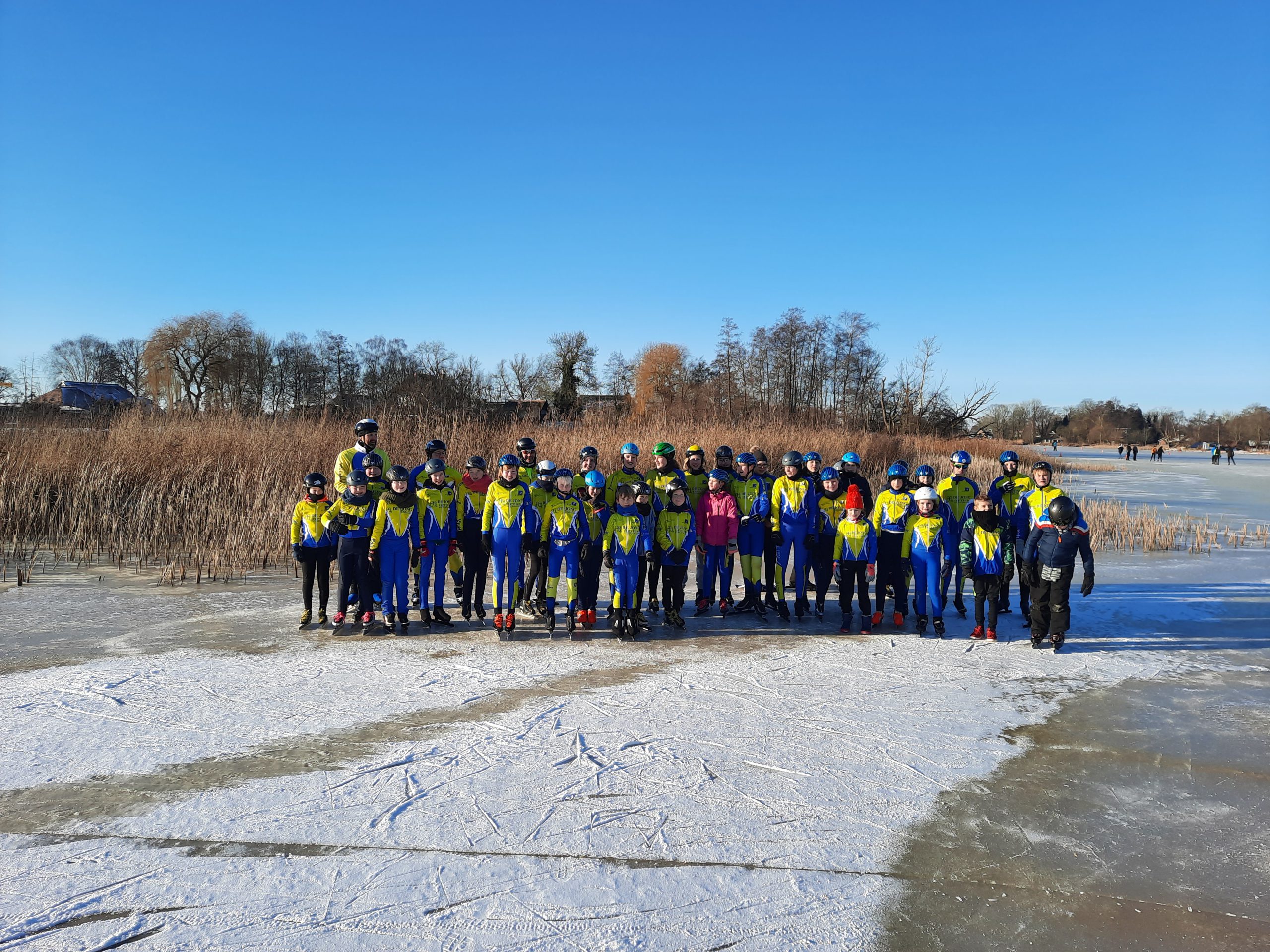 Op het Molengat was voldoende goed ijs te vinden om er een gevarieerde training van te maken.. Onder supervisie van Wim van der Heide en de pas aangetreden coördinator Natuurijs werden er groepen gevormd. Joan Lubbinge, Gerard Oord, Anna Sybrandy en Jeanne van Duinkerken verzorgden de training. Na de kennismaking met het ijs werd er begonnen. De opdrachten en aanwijzingen werden goed opgevolgd. Wat deden ze hun best om te letten op hun schaatshouding. De vaart zat er goed in. Er werden zelfs starts gemaakt, wel met drie op een rij. Ruimte zat! De training werd afgesloten met een estafette en een groepsfoto. Het zal iedereen nog lang heugen.