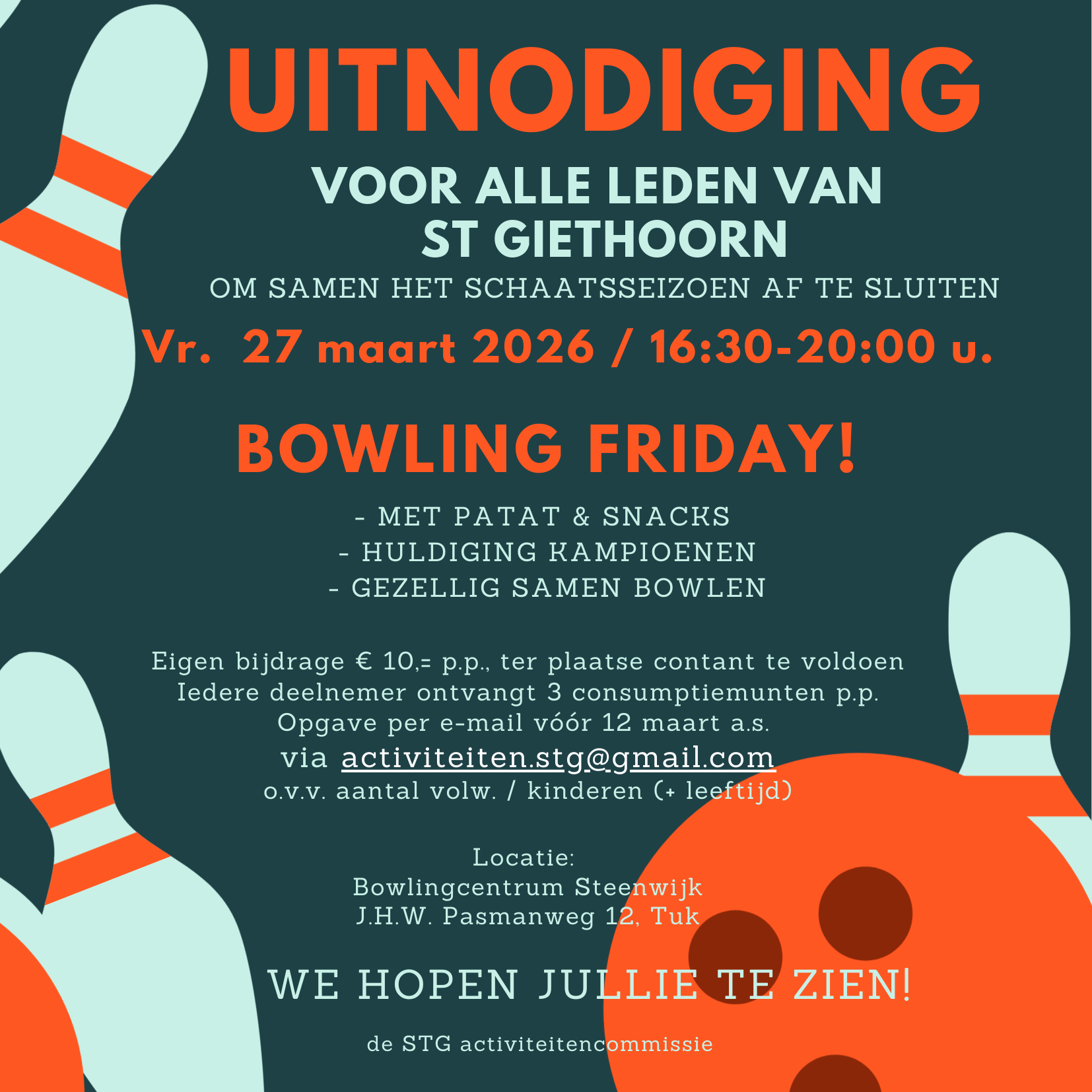 Zoals al eerder kenbaar gemaakt organiseert de activiteitencommissie van STG op vrijdag 27 maart de gezamenlijke afsluiting van het schaatsseizoen. Graag nodigen wij je hierbij uit voor Bowling Friday!
